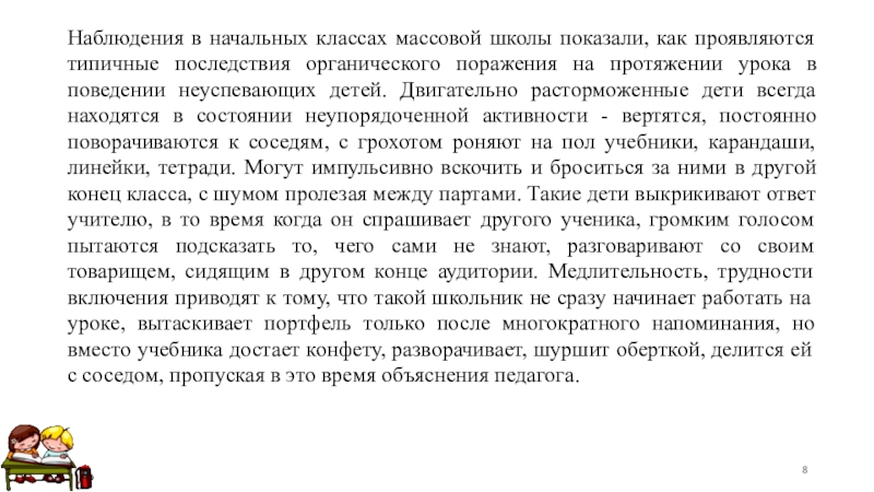 органического поражения на протяжении урока в поведении неуспевающих детей. Двигательно расторможенные дети всегда находятся в состоянии неупорядоченной активности - вертятся, постоянно поворачиваются к соседям, с грохотом роняют на пол учебники, карандаши, линейки, тетради. Могут импульсивно вскочить и броситься за ними в другой конец класса, с шумом пролезая между партами. Такие дети выкрикивают ответ учителю, в то время когда он спрашивает другого ученика, громким голосом пытаются подсказать то, чего сами не знают, разговаривают со своим товарищем, сидящим в другом конце аудитории. Медлительность, трудности включения приводят к тому, что такой школьник не сразу начинает работать на уроке, вытаскивает портфель только после многократного напоминания, но вместо учебника достает конфету, разворачивает, шуршит оберткой, делится ей с соседом, пропуская в это время объяснения педагога.