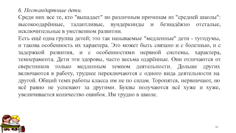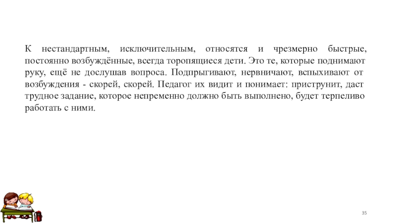 Слайд 35К нестандартным, исключительным, относятся и чрезмерно быстрые, постоянно возбуждённые, всегда торопящиеся
