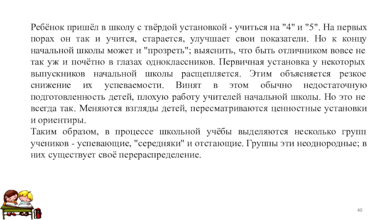 Слайд 40Ребёнок пришёл в школу с твёрдой установкой - учиться на "4"