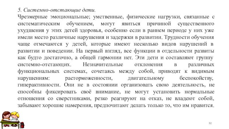 могут явиться причиной существенного ухудшения у этих детей здоровья, особенно если в раннем периоде у них уже имели место различные нарушения и задержки в развитии. Трудности обучения чаще отмечаются у детей, которые имеют несколько видов нарушений в развитии и поведении. На первый взгляд, все функции в отдельности развиты как будто достаточно, а общей гармонии нет. Эти дети и составляют группу системно-отстающих. Незначительные отклонения в различных функциональных системах, сочетаясь между собой, приводят к видимым нарушениям: расторможенности, двигательному беспокойству, гиперактивности. Они не в состоянии организовать свою деятельность, не способны фиксировать своё внимание, не могут установить нормальные отношения со сверстниками, резко реагируют на отказ, не владеют собой, забывают хорошие намерения, предпочитают делать только то, что им нравится.
