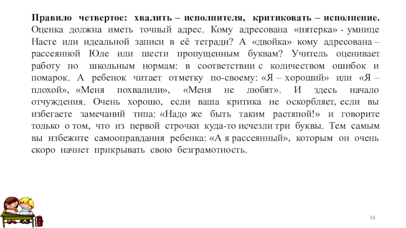Слайд 53Правило четвертое: хвалить – исполнителя, критиковать – исполнение. Оценка должна иметь