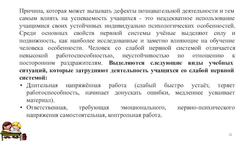 Слайд 22Причина, которая может вызывать дефекты познавательной деятельности и тем самым влиять