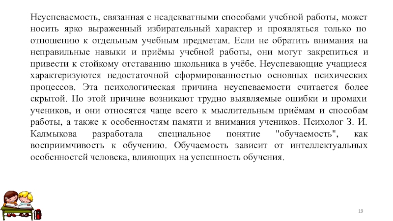 Слайд 19Неуспеваемость, связанная с неадекватными способами учебной работы, может носить ярко выраженный