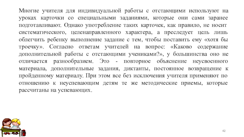 Слайд 42Многие учителя для индивидуальной работы с отстающими используют на уроках карточки