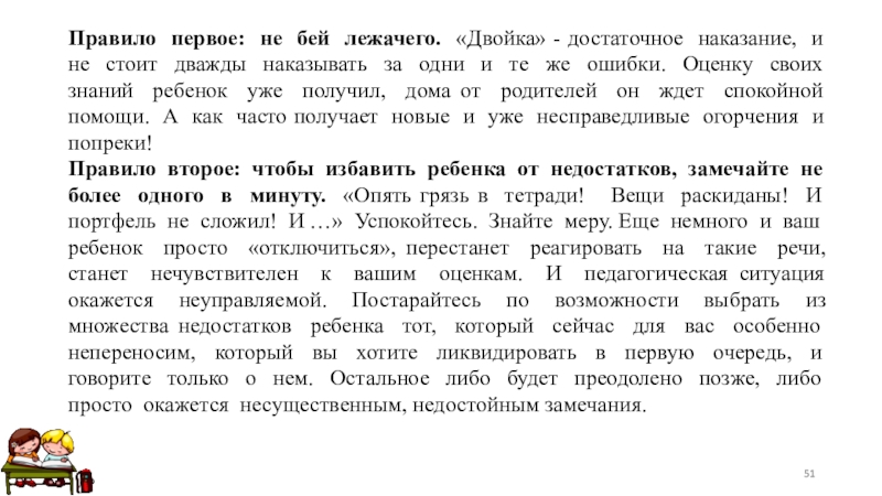 Слайд 51Правило первое: не бей лежачего. «Двойка» - достаточное наказание, и не