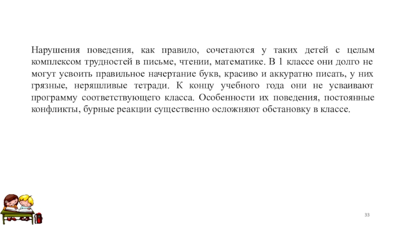 Слайд 33Нарушения поведения, как правило, сочетаются у таких детей с целым комплексом