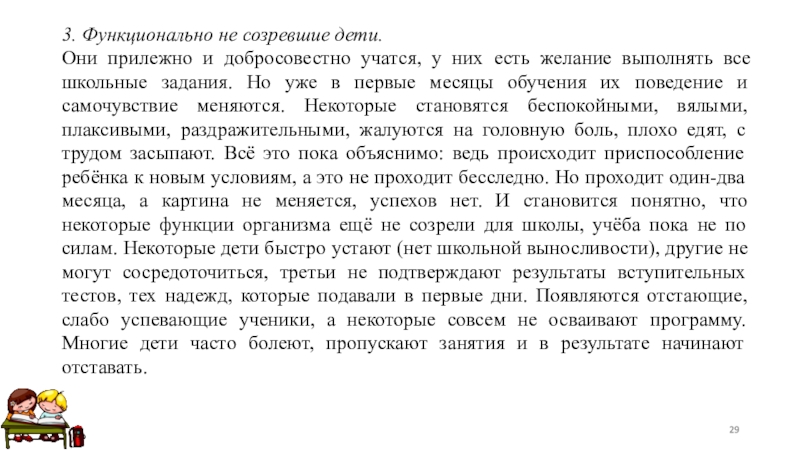 есть желание выполнять все школьные задания. Но уже в первые месяцы обучения их поведение и самочувствие меняются. Некоторые становятся беспокойными, вялыми, плаксивыми, раздражительными, жалуются на головную боль, плохо едят, с трудом засыпают. Всё это пока объяснимо: ведь происходит приспособление ребёнка к новым условиям, а это не проходит бесследно. Но проходит один-два месяца, а картина не меняется, успехов нет. И становится понятно, что некоторые функции организма ещё не созрели для школы, учёба пока не по силам. Некоторые дети быстро устают (нет школьной выносливости), другие не могут сосредоточиться, третьи не подтверждают результаты вступительных тестов, тех надежд, которые подавали в первые дни. Появляются отстающие, слабо успевающие ученики, а некоторые совсем не осваивают программу. Многие дети часто болеют, пропускают занятия и в результате начинают отставать.