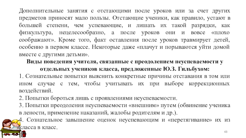 Слайд 43Дополнительные занятия с отстающими после уроков или за счет других предметов