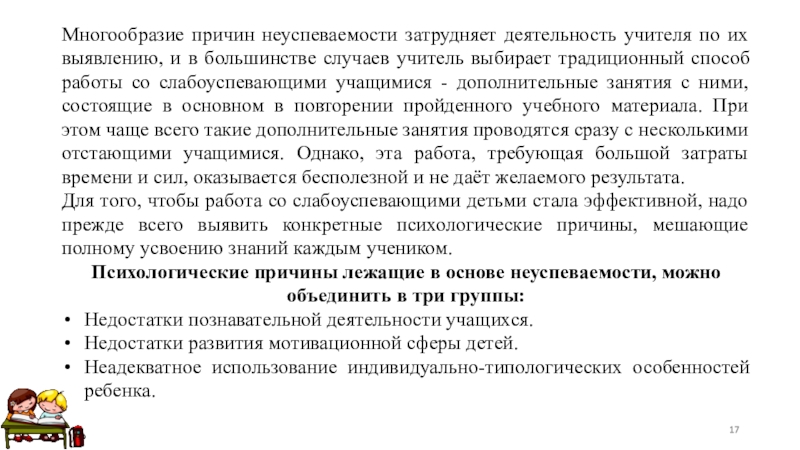 Слайд 17Многообразие причин неуспеваемости затрудняет деятельность учителя по их выявлению, и в