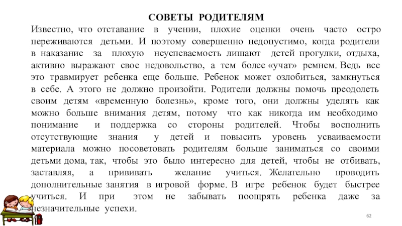 переживаются детьми. И поэтому совершенно недопустимо, когда родители в наказание за плохую неуспеваемость лишают детей прогулки, отдыха, активно выражают свое недовольство, а тем более «учат» ремнем. Ведь все это травмирует ребенка еще больше. Ребенок может озлобиться, замкнуться в себе. А этого не должно произойти. Родители должны помочь преодолеть своим детям «временную болезнь», кроме того, они должны уделять как можно больше внимания детям, потому что как никогда им необходимо понимание и поддержка со стороны родителей. Чтобы восполнить отсутствующие знания у детей и повысить уровень усваиваемости материала можно посоветовать родителям больше заниматься со своими детьми дома, так, чтобы это было интересно для детей, чтобы не отбивать, заставляя, а прививать желание учиться. Желательно проводить дополнительные занятия в игровой форме. В игре ребенок будет быстрее учиться. И при этом не забывать поощрять ребенка даже за незначительные успехи.