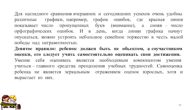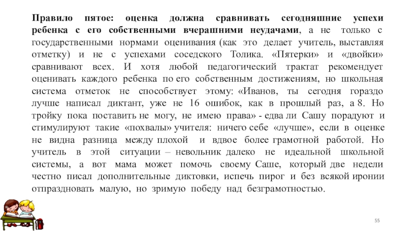 Слайд 55Правило пятое: оценка должна сравнивать сегодняшние успехи ребенка с его собственными