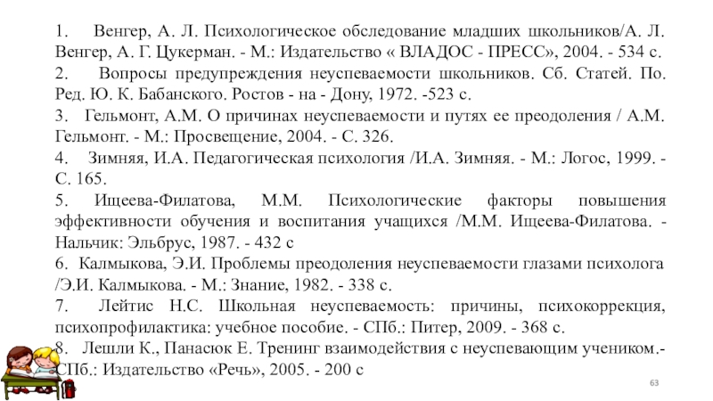 Слайд 631. Венгер, А. Л. Психологическое обследование младших школьников/А. Л. Венгер,