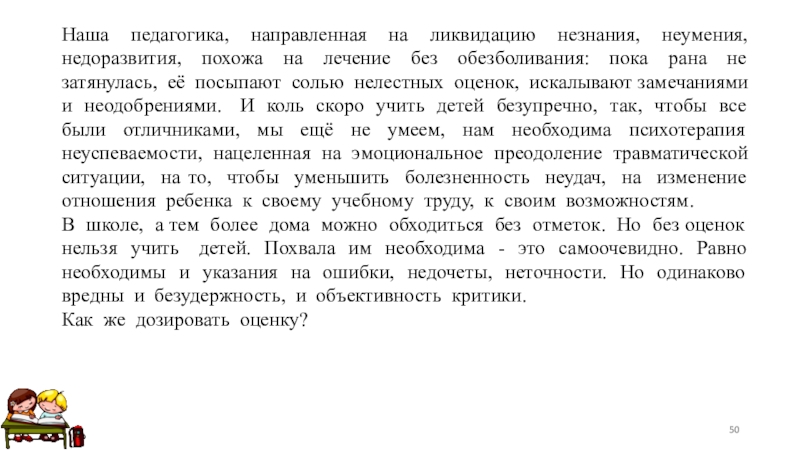 Слайд 50Наша педагогика, направленная на ликвидацию незнания, неумения, недоразвития, похожа на лечение