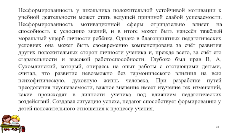 ведущей причиной слабой успеваемости. Несформированность мотивационной сферы отрицательно влияет на способность к усвоению знаний, и в итоге может быть нанесён тяжёлый моральный ущерб личности ребёнка. Однако в благоприятных педагогических условиях она может быть своевременно компенсирована за счёт развития других положительных сторон личности ученика и, прежде всего, за счёт его старательности и высокой работоспособности. Глубоко был прав В. А. Сухомлинский, который, опираясь на опыт работы с отстающими детьми, считал, что развитие невозможно без гармонического влияния на всю психофизическую, духовную жизнь человека. При разработке путей преодоления неуспеваемости, важное значение имеет изучение тех изменений, какие происходят в личности ученика под влиянием педагогических воздействий. Создавая ситуацию успеха, педагог способствует формированию у детей положительного отношения к процессу учения.