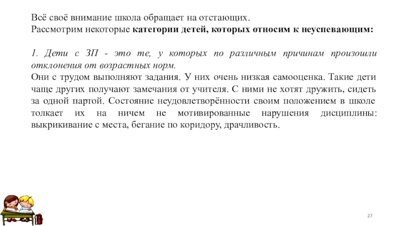 Они с трудом выполняют задания. У них очень низкая самооценка. Такие дети чаще других получают замечания от учителя. С ними не хотят дружить, сидеть за одной партой. Состояние неудовлетворённости своим положением в школе толкает их на ничем не мотивированные нарушения дисциплины: выкрикивание с места, бегание по коридору, драчливость.