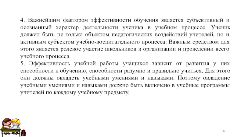 Слайд 474. Важнейшим фактором эффективности обучения является субъективный и осознанный характер деятельности