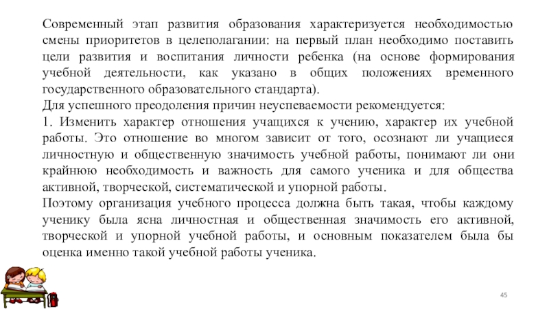 Слайд 45Современный этап развития образования характеризуется необходимостью смены приоритетов в целеполагании: на