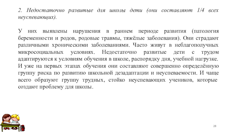 Слайд 282. Недостаточно развитые для школы дети (они составляют 1/4 всех неуспевающих).