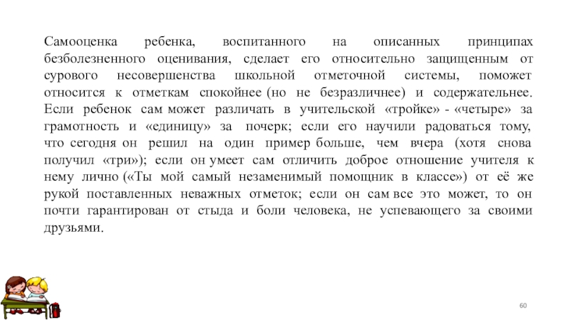 Самооценка ребенка, воспитанного на описанных принципах безболезненного оценивания, сделает его относительно