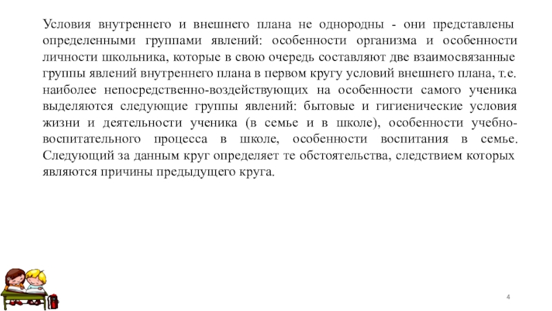 Слайд 4Условия внутреннего и внешнего плана не однородны - они представлены определенными