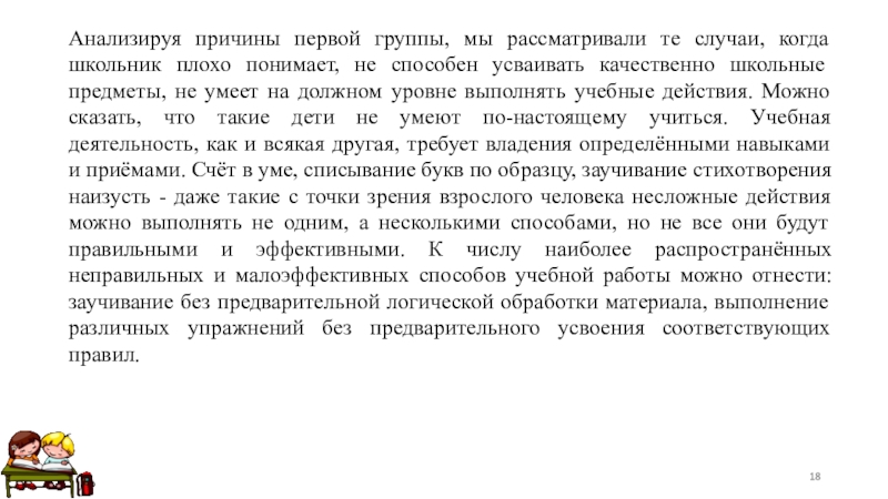 Слайд 18Анализируя причины первой группы, мы рассматривали те случаи, когда школьник плохо