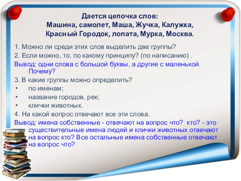 Вывод: имена собственные - отвечают на вопрос что? кто? - это существительные имена людей и клички животных отвечают на вопрос кто? Все остальные имена собственные отвечают на вопрос что?