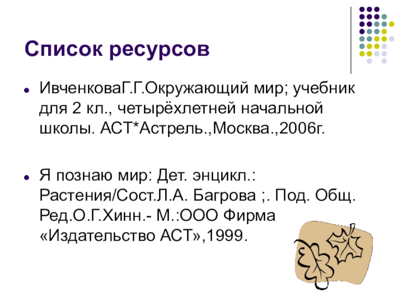 Список ресурсовИвченковаГ.Г.Окружающий мир; учебник для 2 кл., четырёхлетней начальной школы. АСТ*Астрель.,Москва.,2006г.Я познаю мир: Дет. энцикл.: Растения/Сост.Л.А. Багрова