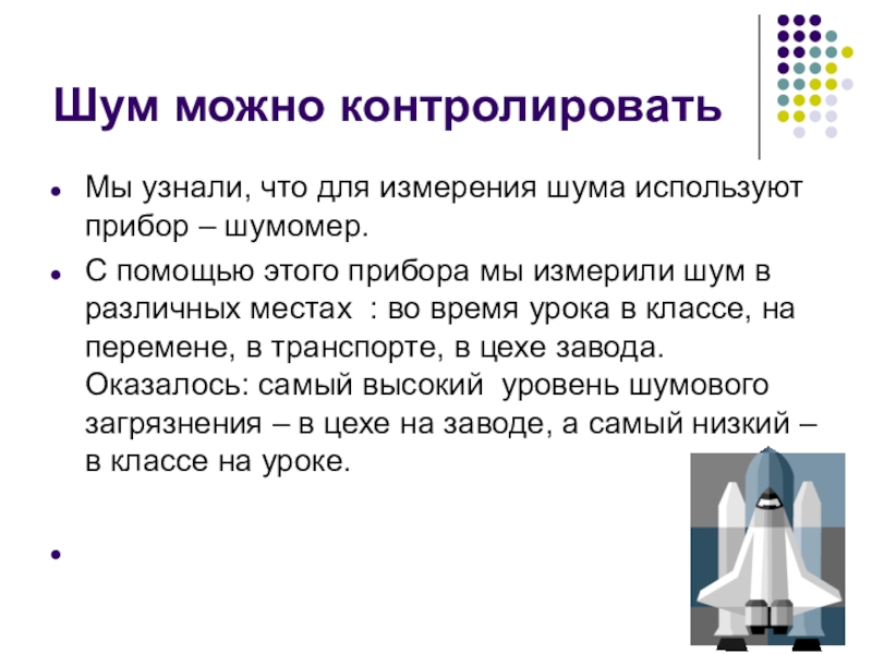 Шум можно контролироватьМы узнали, что для измерения шума используют прибор – шумомер.С помощью этого прибора мы измерили