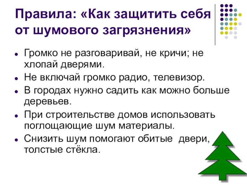 Правила: «Как защитить себя от шумового загрязнения»Громко не разговаривай, не кричи; не хлопай дверями.Не включай громко радио,