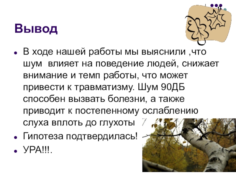ВыводВ ходе нашей работы мы выяснили ,что шум влияет на поведение людей, снижает внимание и темп работы,