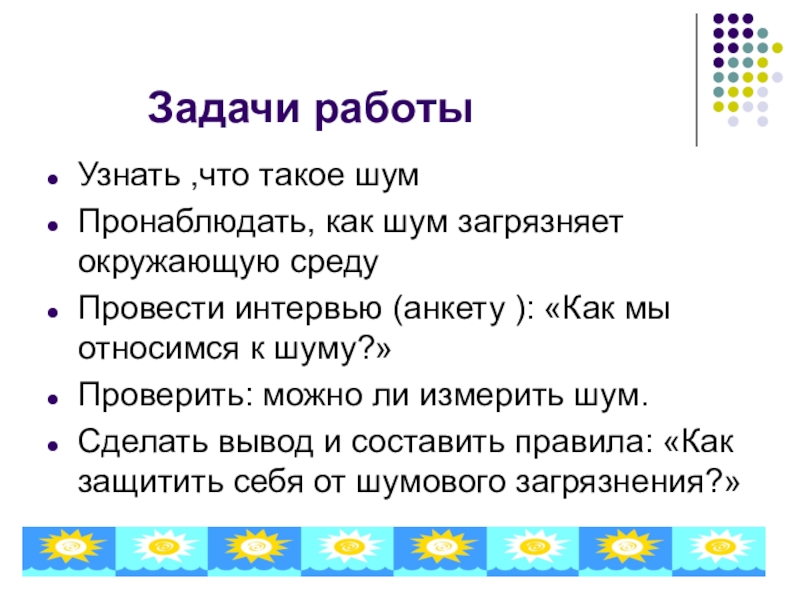Задачи работы Узнать ,что такое шумПронаблюдать, как шум загрязняет окружающую средуПровести интервью (анкету ): «Как мы относимся