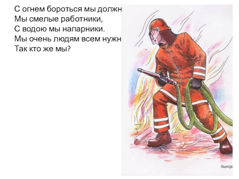 С огнем бороться мы должны – Мы смелые работники, С водою мы напарники. Мы очень людям всем