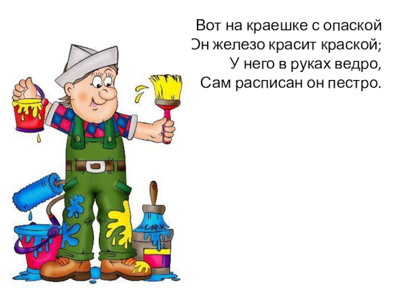 Вот на краешке с опаской  Он железо красит краской;  У него в руках ведро, Сам расписан он