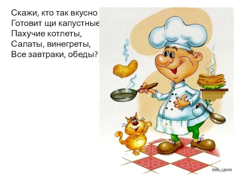 Скажи, кто так вкусно Готовит щи капустные, Пахучие котлеты, Салаты, винегреты, Все завтраки, обеды?