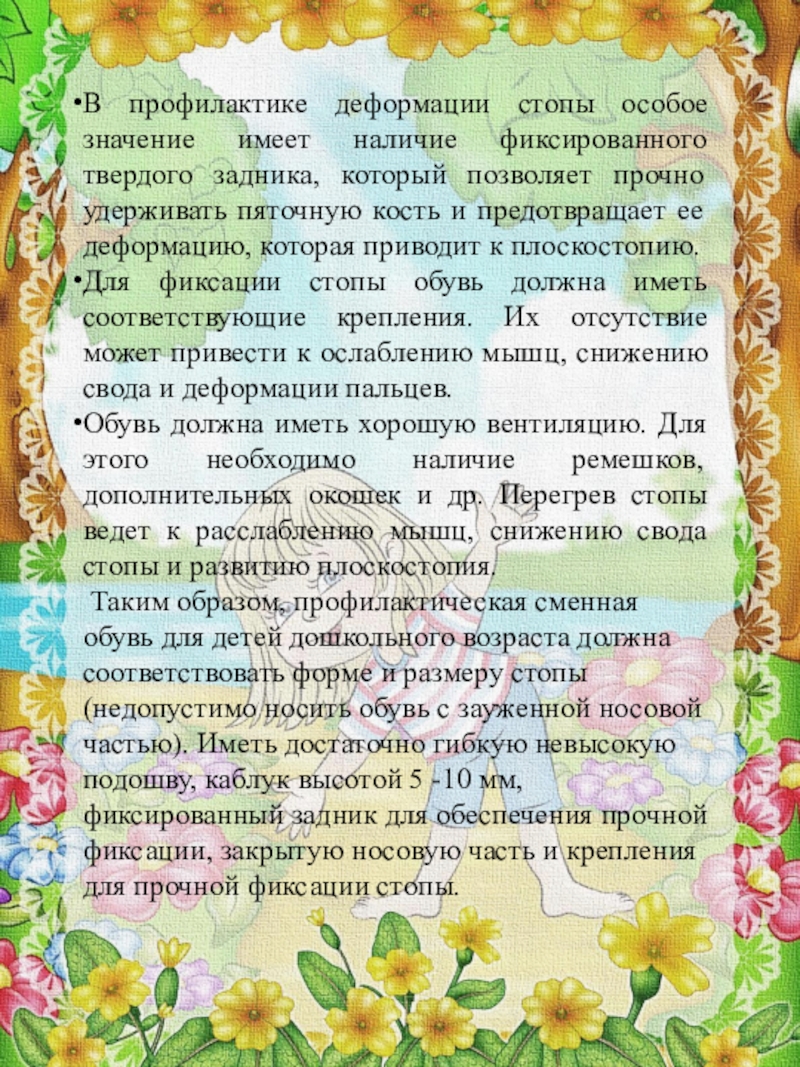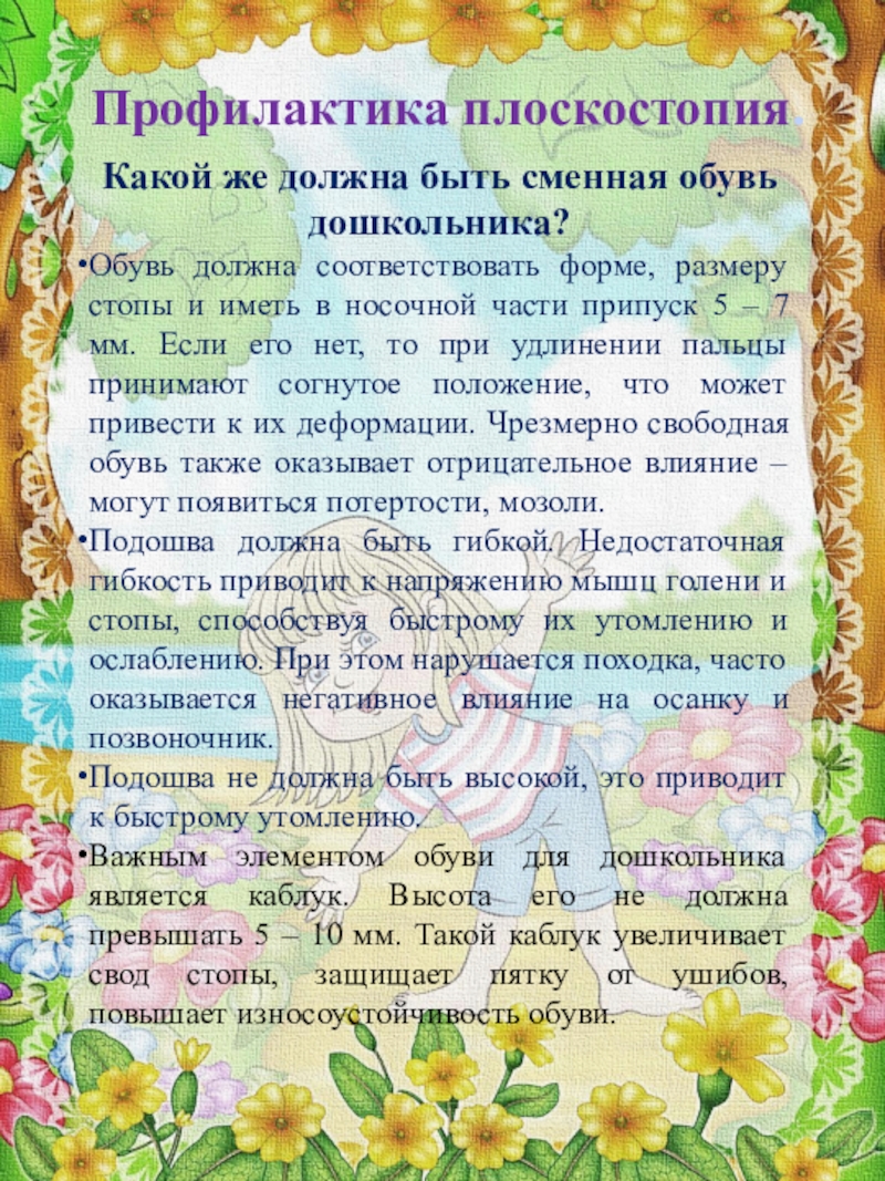 Важным элементом обуви для дошкольника является каблук. Высота его не должна превышать 5 – 10 мм. Такой каблук увеличивает свод стопы, защищает пятку от ушибов, повышает износоустойчивость обуви.