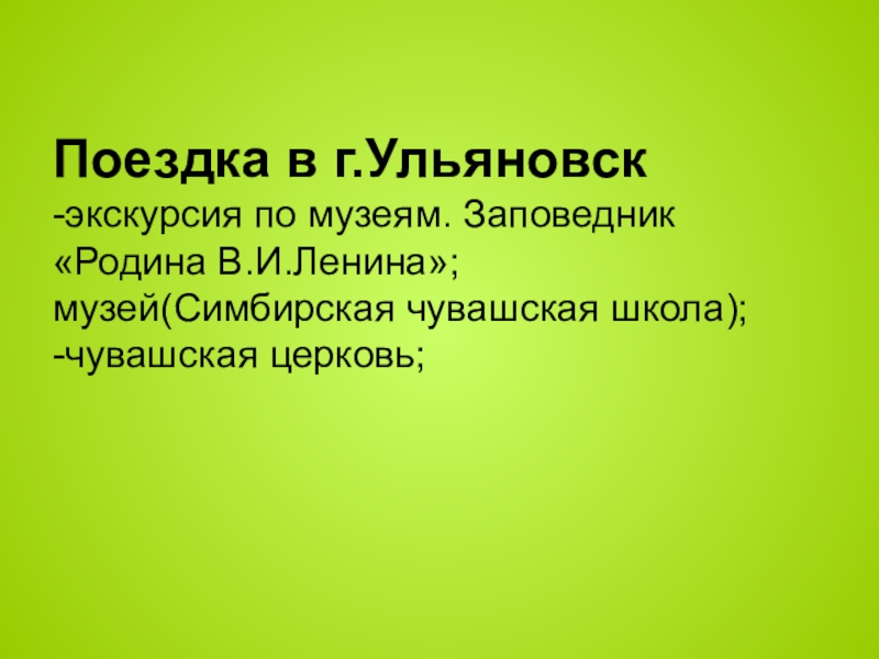 Слайд 13Поездка в г.Ульяновск -экскурсия по музеям. Заповедник «Родина В.И.Ленина»; музей(Симбирская чувашская школа); -чувашская
