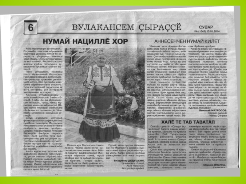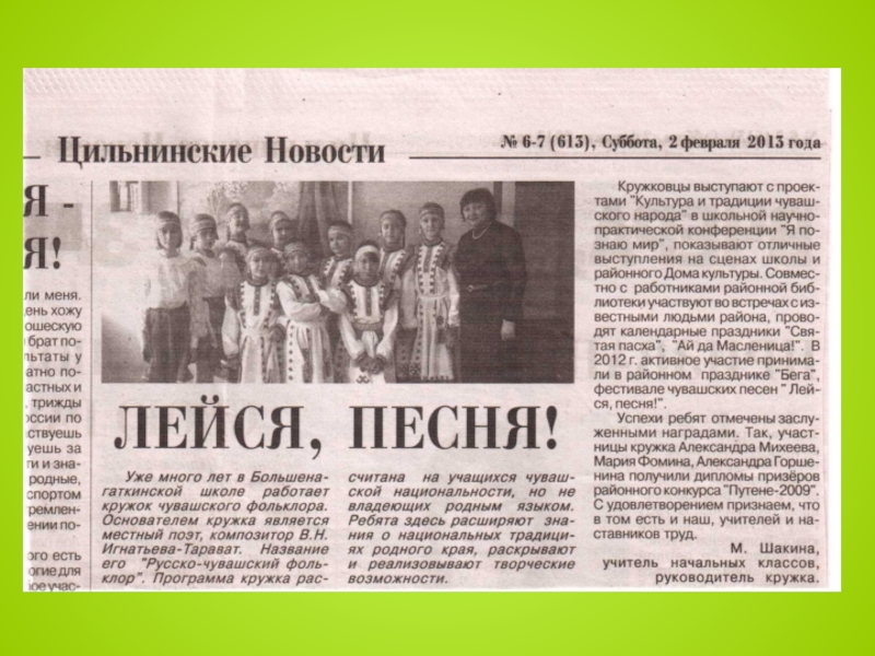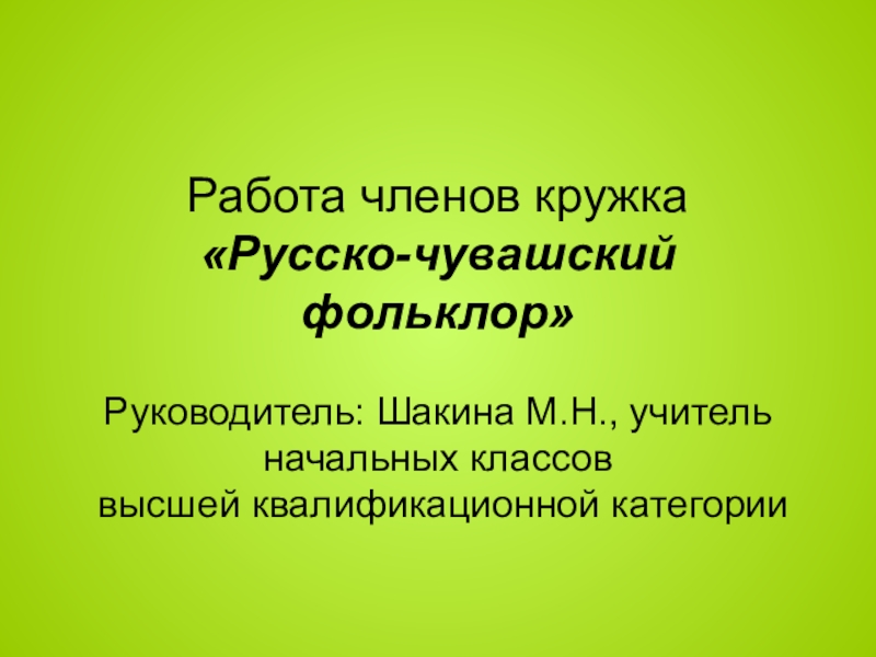 Слайд 1Работа членов кружка «Русско-чувашский фольклор» Руководитель: Шакина М.Н., учитель начальных классов