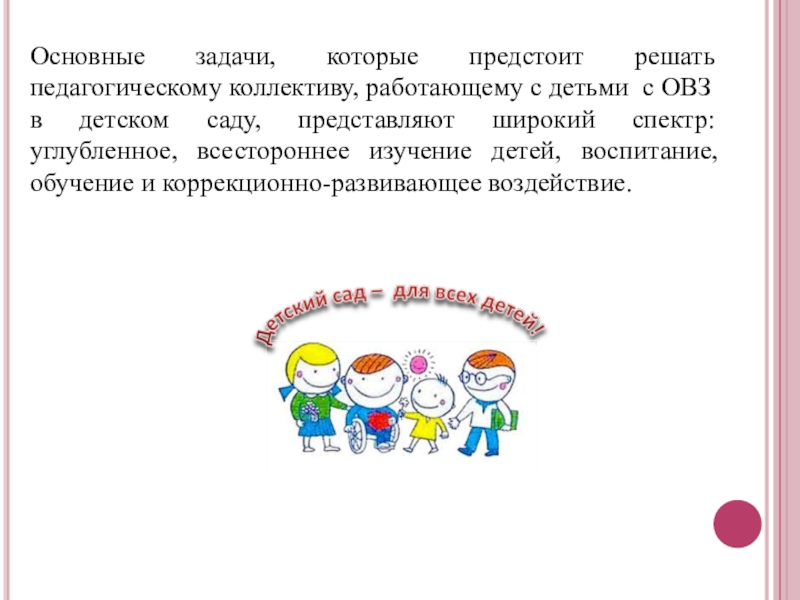 Слайд 3Основные задачи, которые предстоит решать педагогическому коллективу, работающему с детьми с