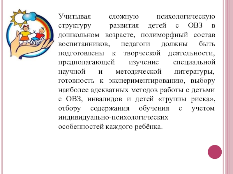 Слайд 16Учитывая сложную психологическую структуру развития детей с ОВЗ в дошкольном возрасте,