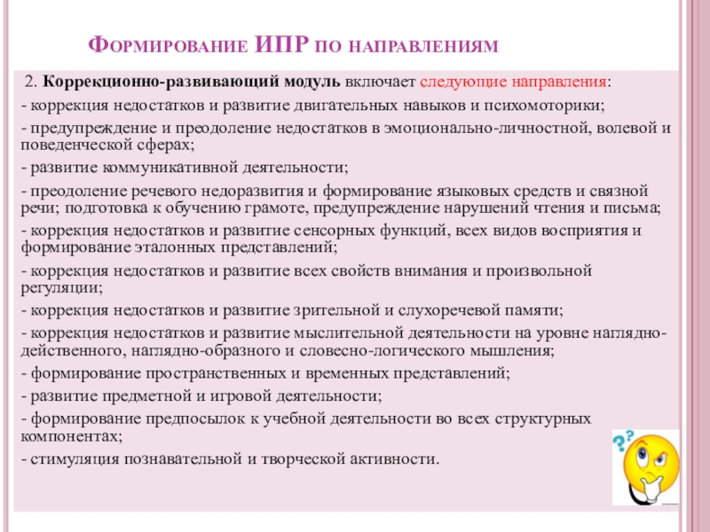 2. Коррекционно-развивающий модуль включает следующие направления: