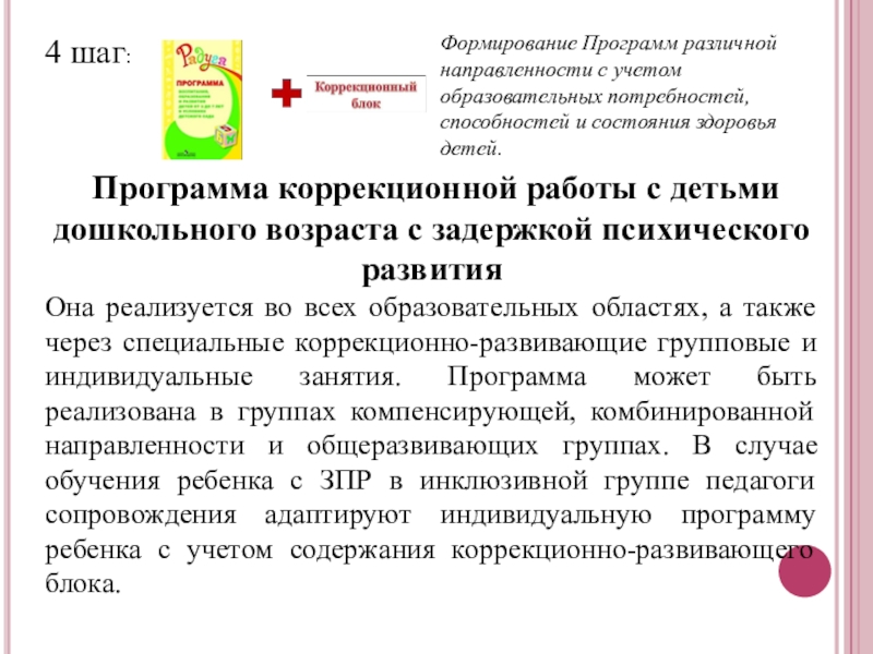 Она реализуется во всех образовательных областях, а также через специальные коррекционно-развивающие групповые и индивидуальные занятия. Программа может быть реализована в группах компенсирующей, комбинированной направленности и общеразвивающих группах. В случае обучения ребенка с ЗПР в инклюзивной группе педагоги сопровождения адаптируют индивидуальную программу ребенка с учетом содержания коррекционно-развивающего блока.