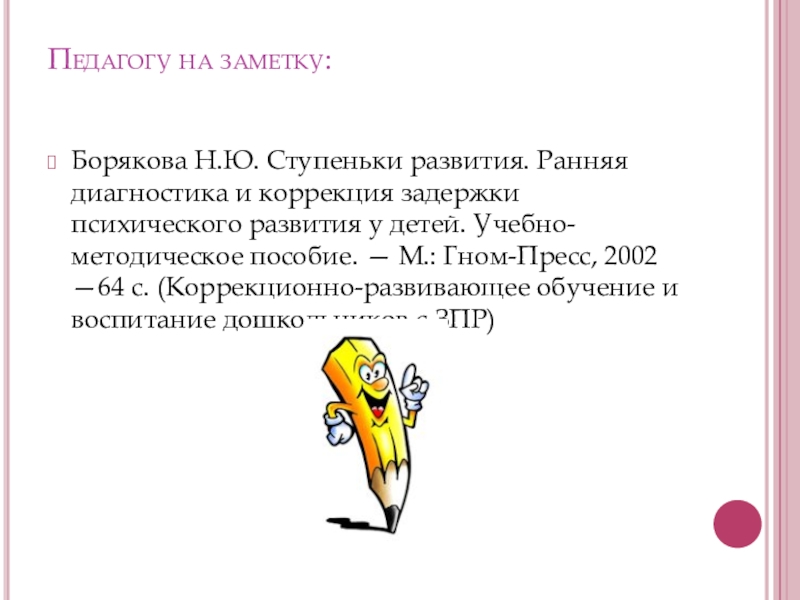 задержки психического развития у детей. Учебно-методическое пособие. — М.: Гном-Пресс, 2002 —64 с. (Коррекционно-развивающее обучение и воспитание дошкольников с ЗПР)