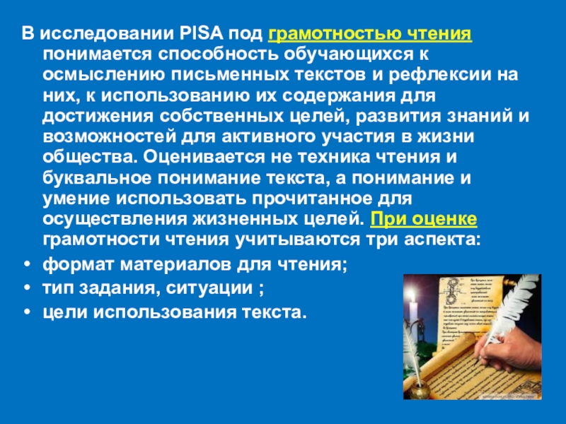 письменных текстов и рефлексии на них, к использованию их содержания для достижения собственных целей, развития знаний и возможностей для активного участия в жизни общества. Оценивается не техника чтения и буквальное понимание текста, а понимание и умение использовать прочитанное для осуществления жизненных целей. При оценке грамотности чтения учитываются три аспекта: