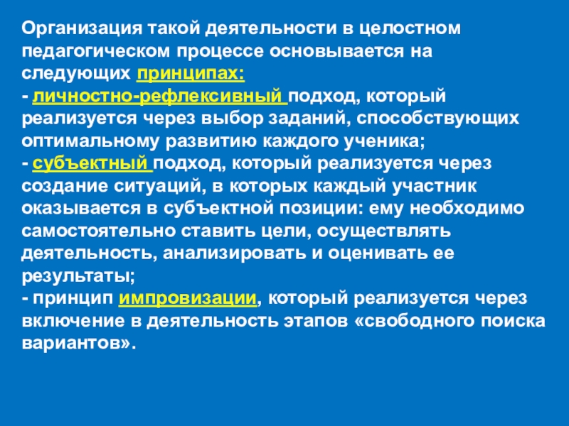 Слайд 14Организация такой деятельности в целостном педагогическом процессе основывается на следующих принципах: