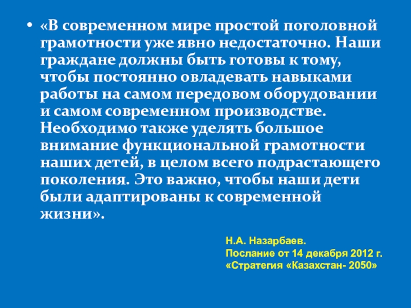 Слайд 3«В современном мире простой поголовной грамотности уже явно недостаточно. Наши граждане