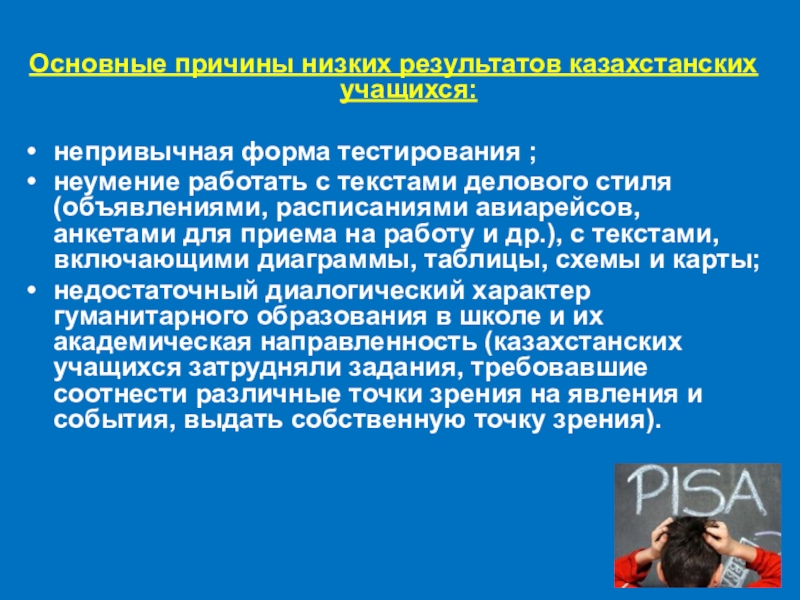 Слайд 9Основные причины низких результатов казахстанских учащихся:
