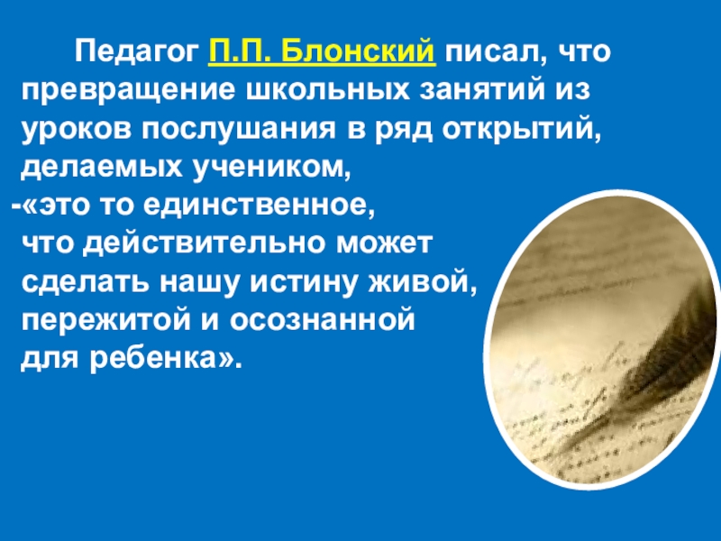 Слайд 13 Педагог П.П. Блонский писал, что превращение школьных занятий