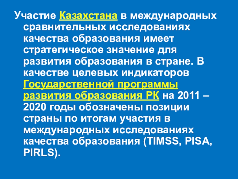 для развития образования в стране. В качестве целевых индикаторов Государственной программы развития образования РК на 2011 – 2020 годы обозначены позиции страны по итогам участия в международных исследованиях качества образования (TIMSS, PISA, PIRLS).