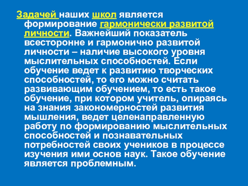 всесторонне и гармонично развитой личности – наличие высокого уровня мыслительных способностей. Если обучение ведет к развитию творческих способностей, то его можно считать развивающим обучением, то есть такое обучение, при котором учитель, опираясь на знания закономерностей развития мышления, ведет целенаправленную работу по формированию мыслительных способностей и познавательных потребностей своих учеников в процессе изучения ими основ наук. Такое обучение является проблемным.