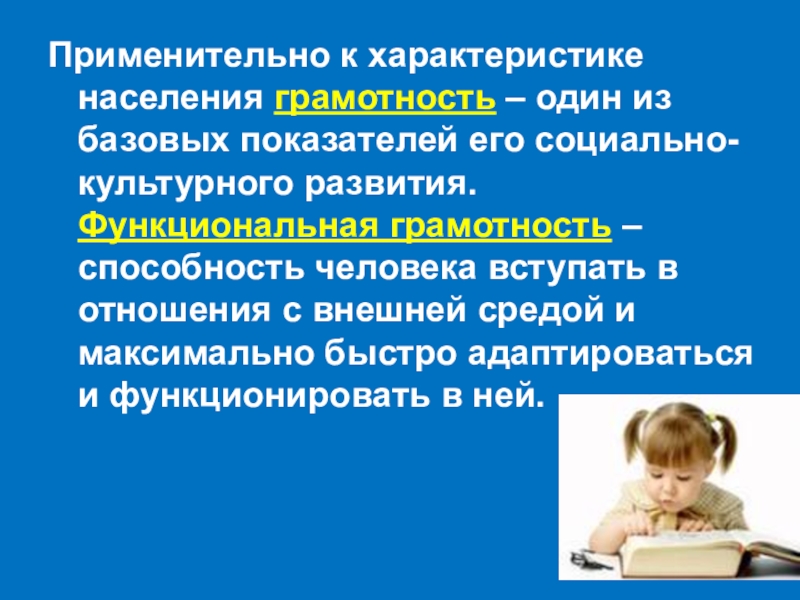 Слайд 4Применительно к характеристике населения грамотность – один из базовых показателей его